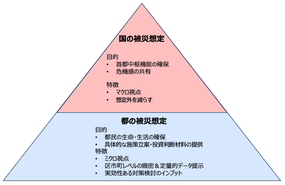 国の被害想定は「首都中枢機能の確保」や「国民全体での危機感の共有」を目的とし、マクロな視点からリスクを提示し、想定外を減らす“構え”を社会に広げる役割を担っています。