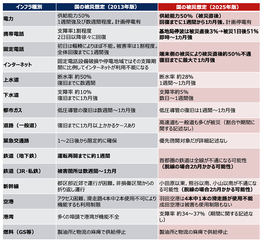 以下の図は、国が今回の想定で提示した主な社会インフラごとの被害規模と復旧期間の目安を一覧にしたものです。BCPや防災体制の再構築の出発点として、この前提をまず正確に把握しておくことが重要です。