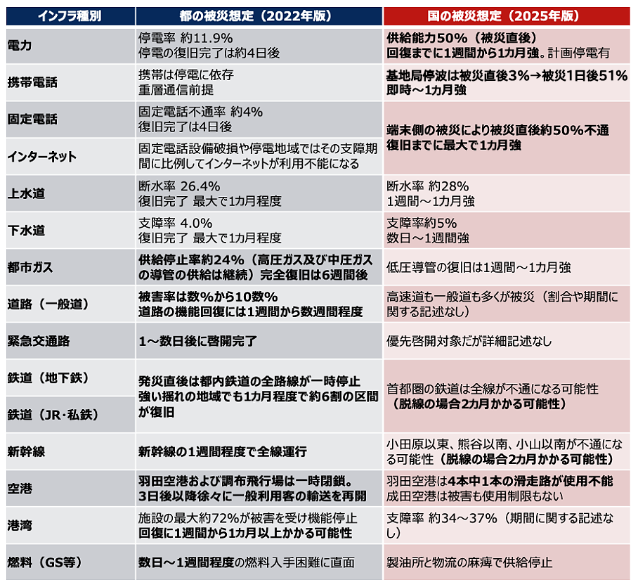 以下の図5は、都と国の被害想定(それぞれ2022年と2025年)を主要インフラごとに比較したものであり、東京都が指摘する「前提のズレ」や「復旧見込みの乖離」を視覚的に確認するうえで参考になります。