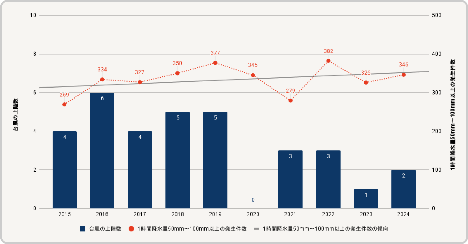 図2:2015年~2024年における台風の上陸数と1時間降水量50mm~100mm以上の発生件数の比較と傾向